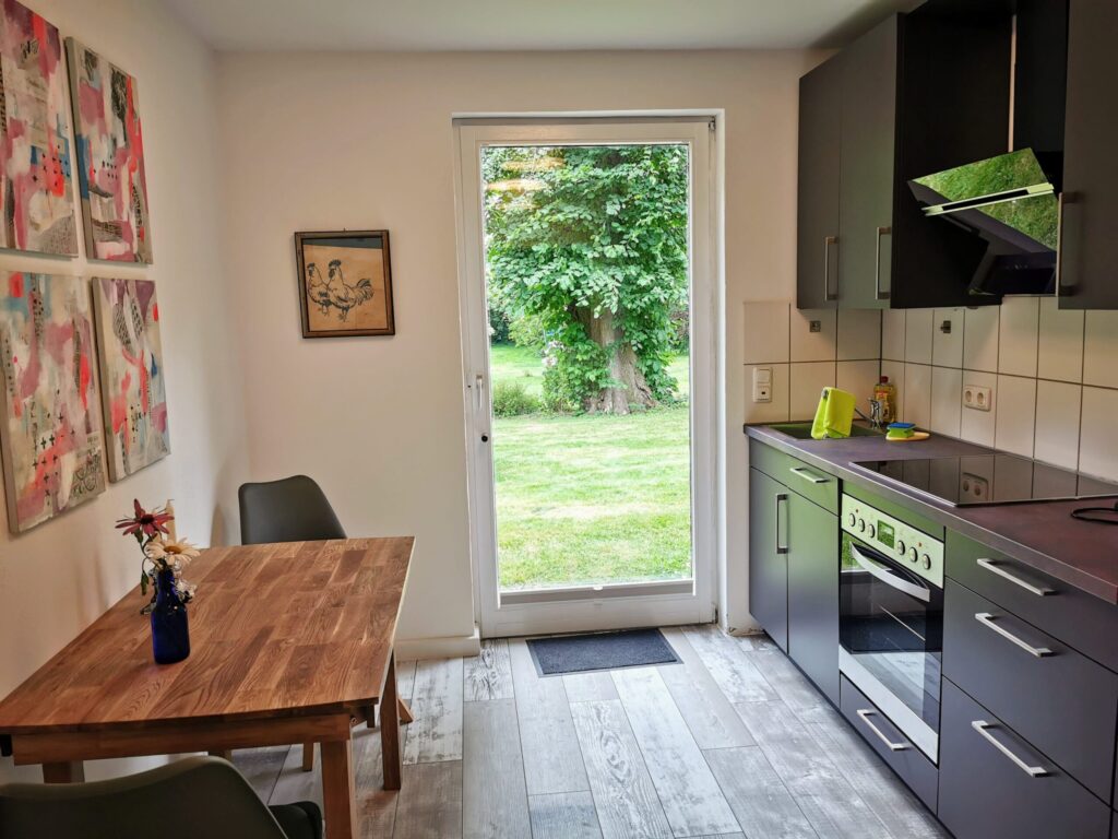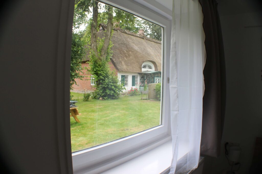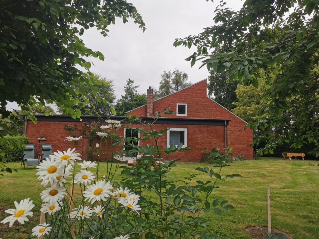 Ihre Ferienwohnung befindet sich im Gästehaus des historischen Ensembles „Altes Pastorat“ – ruhig gelegen und mit eigenem Zugang zum weitläufigen Garten. Hier sehen Sie den Blick von Ihrem idyllischen Frühstücksort der Ferienwohnung, direkt aufs nahe gelegene Haupthaus.